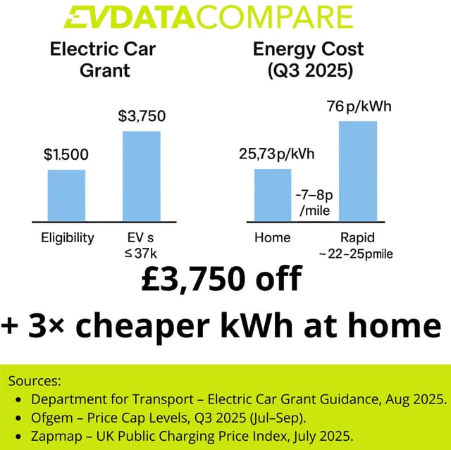 - Public charging prices (reference): weighted average ~51p/kWh (slow/fast), ~76p/kWh (rapid/ultra-rapid)mid-2025; rapid networks range ~52–88p/kWh. (Zapmap)